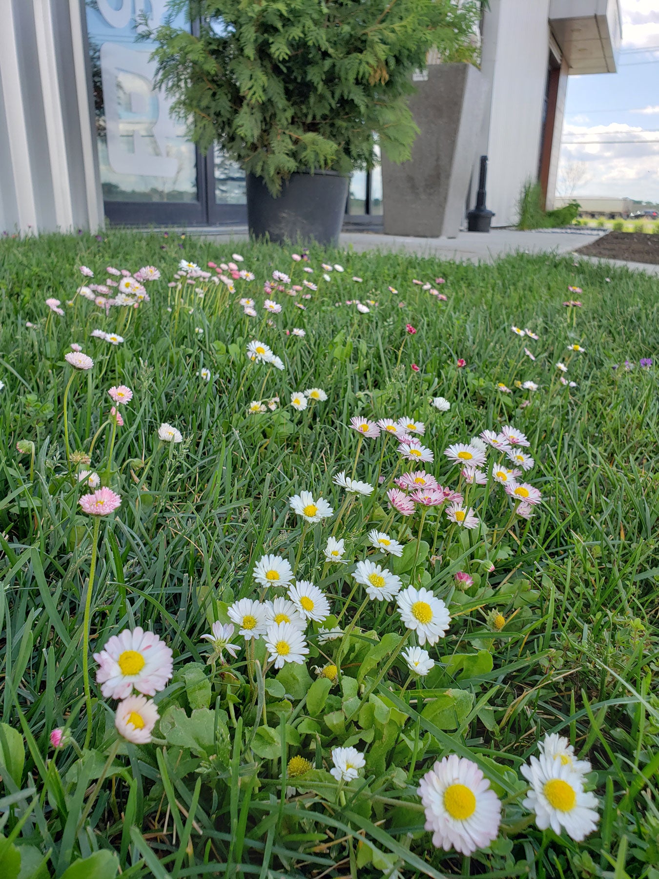 The Éco-Fleurs is a new developing lawn composed of grasses and wildflowers that will reach a height of about 6 inches if we space them out. We usually recommend a monthly shearing.